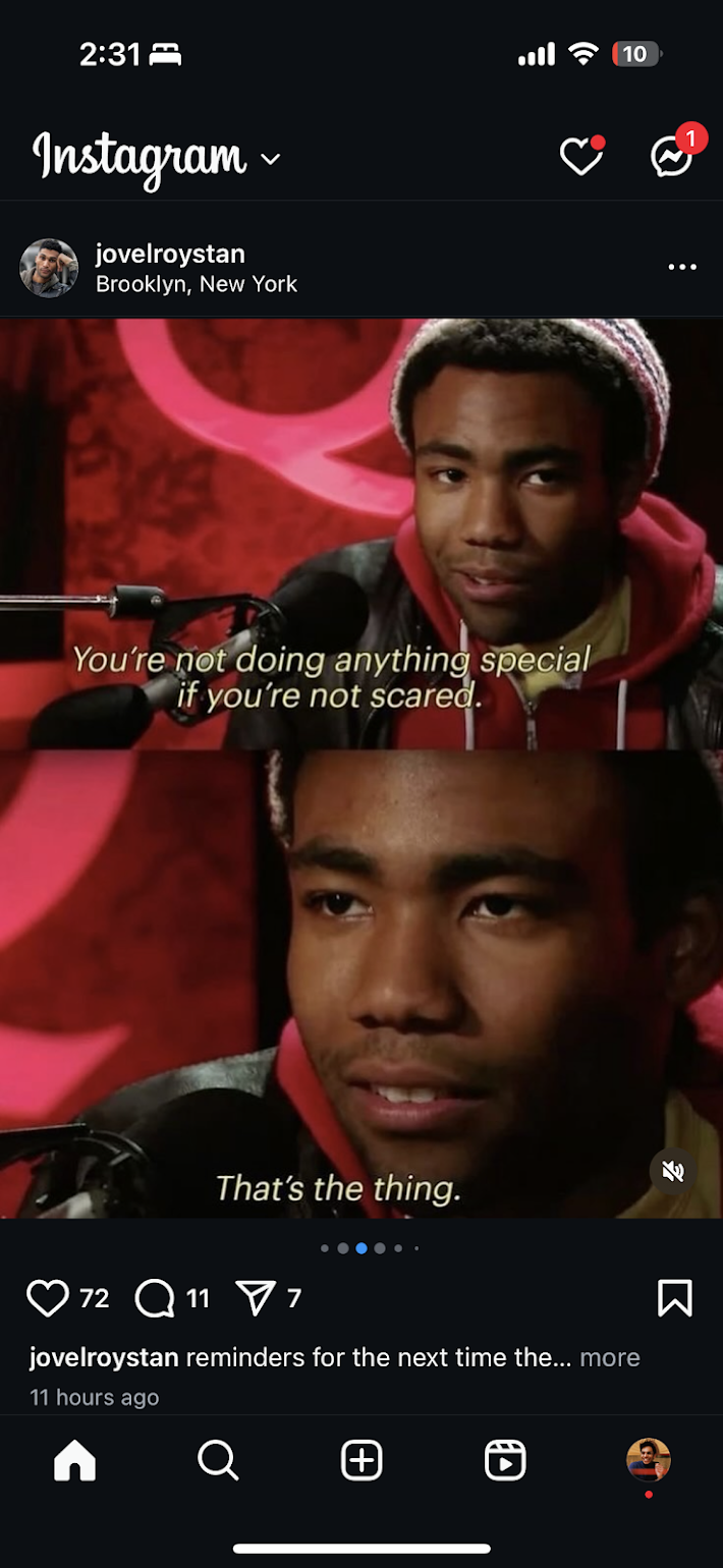 you just need your first courageous thing, like when you realize you’ve hit your breaking point and enough is enough and you’re quitting your job and telling your boss tomorrow. you are now a courageous person, do one more courageous thing drawing on that well of power.